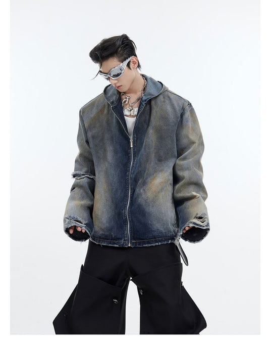 Padded Retro Distressed Hooded Denim Jacket