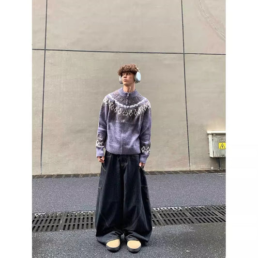Pattern Round Neck Zipper Knitted Lazy Loose Casual Sweater