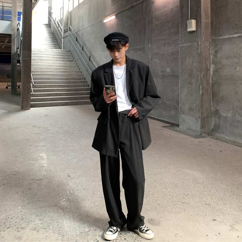 Korean Trend Loose Fitting Striped Suit Set, Versatile For Men In Spring And Summer