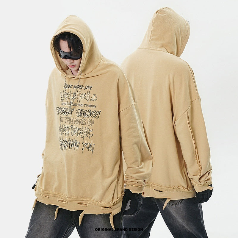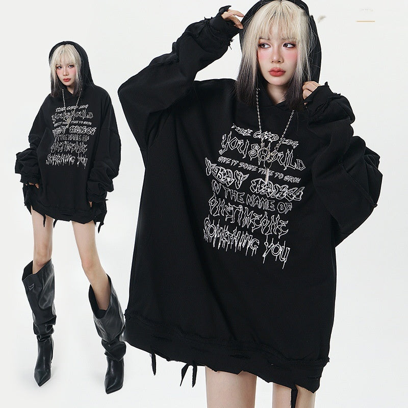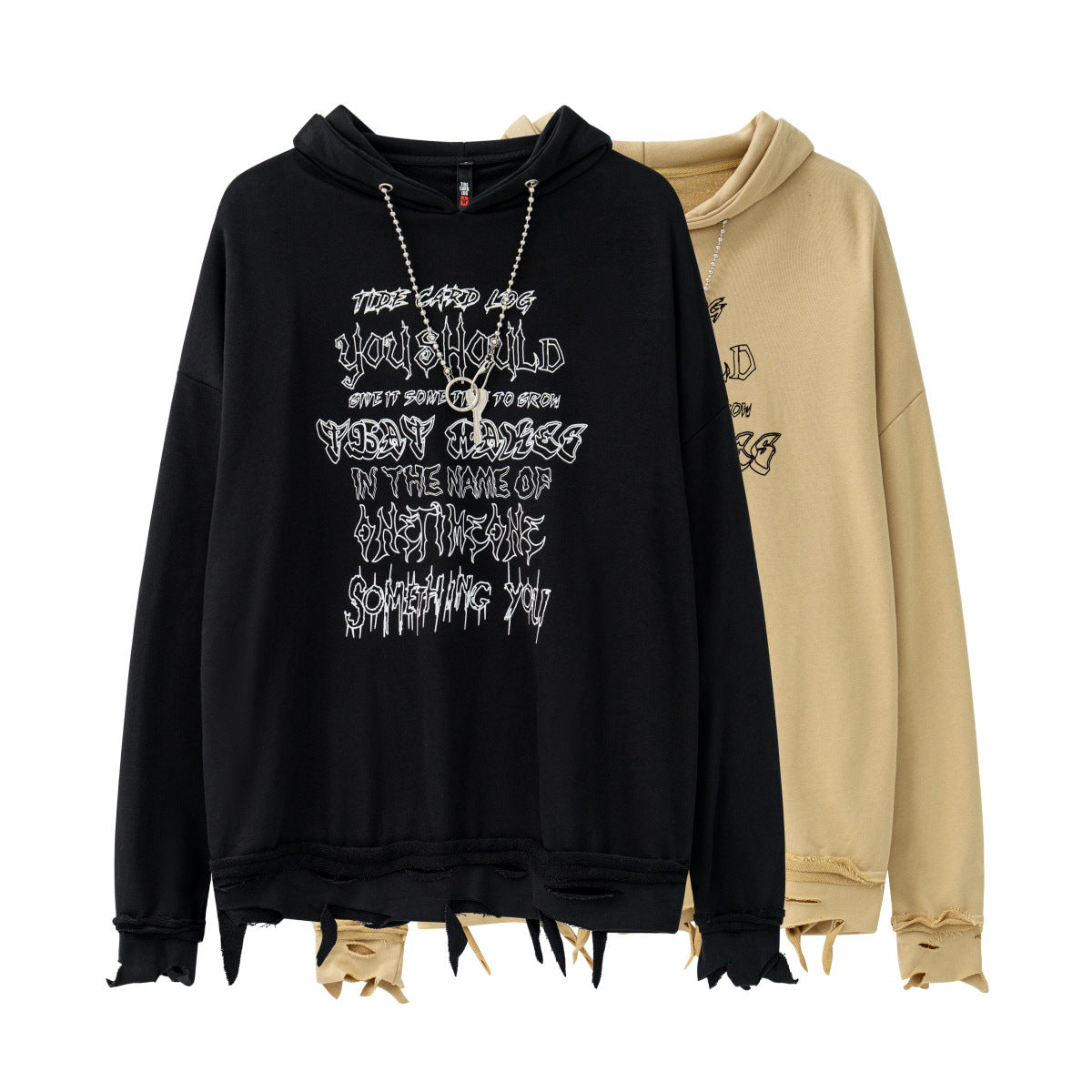 Ripped Hem With Chain Personality Letter Printed Hoodie