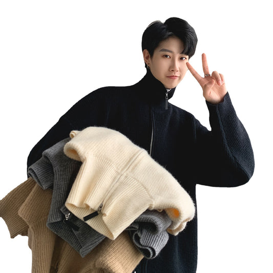 Thick Solid Color Turtleneck Zipper Knitted Cardigan