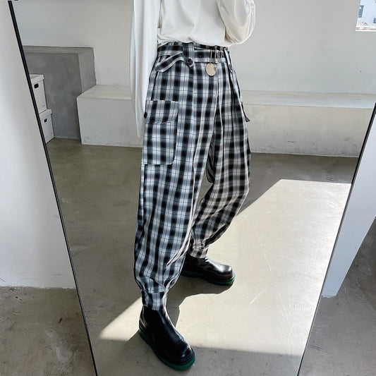 Metal Decorative Belt Plaid Casual Pants