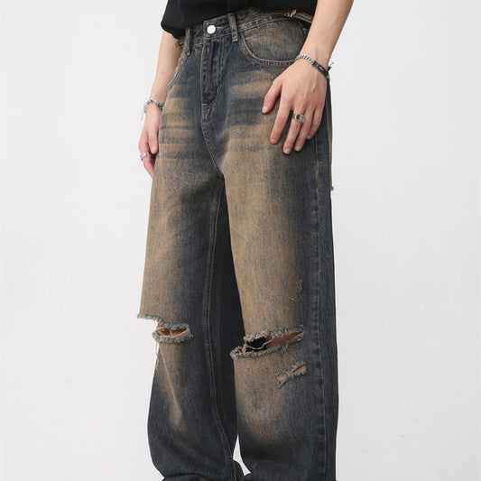 Retro Distressed Rust Earthy Hole Raw Hem Jeans