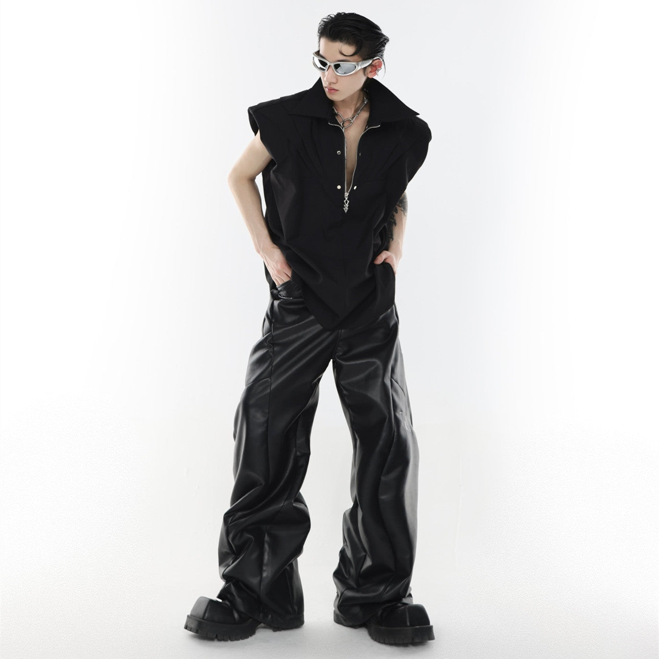 Dimensional Deconstructed Pressed Pleated Padded Shoulder Metal Zip Sleeveless Shirt