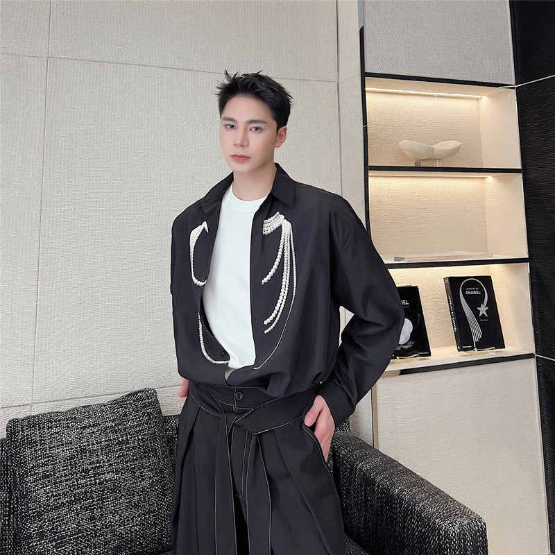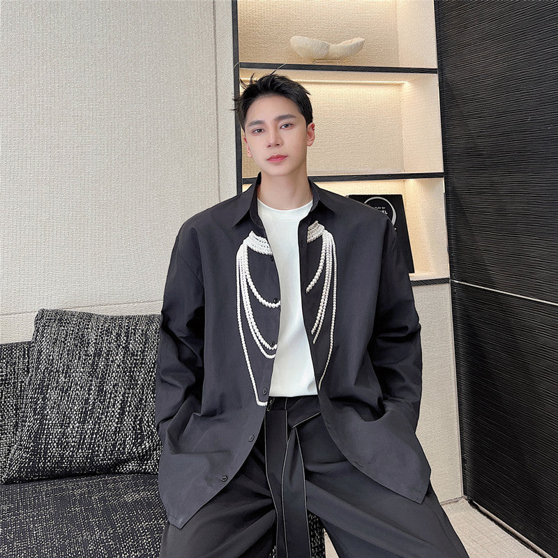 Tide Three-dimensional Pearl Necklace Printed Loose Lazy Shirt